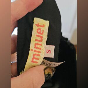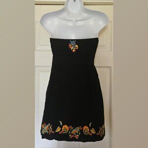 90s/Y2K vintage Minuet babydoll dress-black with colorful flower/floral embroidery detail (mexican or russian designs?-blue,orange,green,yellow)-strapless-soft/flowy/comfy/tailored/some stretch-empire waist-slight flared bottom-elastic edge at the back for fit-side zipper-lined-padded bust-light/medium weight (rayon-linen cotton feel)-quality-above knee/mid thigh-size S-36" bust (34" possible), about 25" total length/22" length from pit down, 15"waist/22"hip (flat,unstretched)-very good condition-