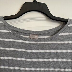 Versatile, stretch knit top or tee from Chico's. It is from the Zenergy line and features a crew neckline, short sleeves, and classic, flattering styling all on a soft, stretch fabric. Gray with white stripes and a split back at the bottom for easy sitting without bunching. Can be dressed up or down. Chico's size 3 or XL.