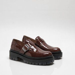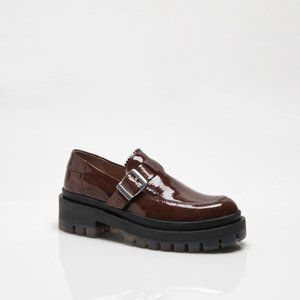 Features: Slip-on style, classic loafer construction, textured patent leather fabrication, round toe, rigged trim tongue, buckle detail, slight platform sole, tread accent