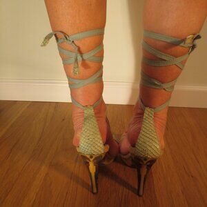 Possibly worn, cant tell because of the stickers, ISABELLA FIORE light green leg lacing high heel sandals, size 6. Snakeskin strap across toe area, rear heel post that leg lace threads through. the leg lace is made of fabric ALSO the platform bases appear to be hand painted Half inch platform base with 5 inch heels NO box or bag