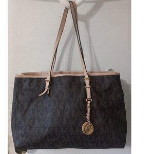 A large MICHAEL KORS Jet Set in brown signature print canvas with leather trim, Gold tone hardware, lots of spacious interior with plenty of room to store all your essentials when traveling, can be used as a tote or shoulder bag. Use the inside slip pocket for storing small items that require easy access. I still have the tag from purchase and comes with a dust bag. In good used condition with some wear. Interior will need to be professionally cleaned. See photos for any wear from storage or use. From a smoke free home.
