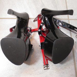 LAST PRICE REDUCTION heading to the trash shortly New, never had a box, CUSTOM MADE, black patent studded ankle cuff high heel platform sandals, size 5. VERY sexy style that I had made for a costume that I didn't end up wearing. T straps with silver metal rings down the front of the foot. Double ankle straps with quick release "S" buckles on the ankle cuffs. Six inch heels with 2 inch platforms 745050