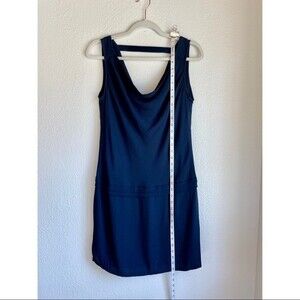 Purchased at a boutique in Paris, but was too small for me - finally gave up trying to fit into it! Super versatile dress with a drape front neckline, a sexy low v-back, and pleat detailing at the dropped waist. Lightweight navy fabric. Classic Parisian chic.