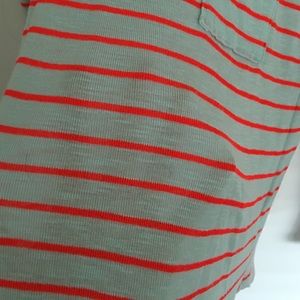 Baby blue with orange stripes. Slightly sheer but no need for a tank underneath. 80% rayon, 20% polyester.