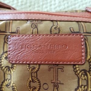 Rust suede with leather bottom, handle and zipper pulls. Gold tone hardware. Two small external side pockets with zipper pulls. Large external pocket with zipper pull. Internal pocket with zipper pull. Satin lining. Tignanello logo in leather. Lining is in excellent condition except for ink stain at bottom corner. Light wear to suede. Piping is cracked in several spots (see pics). 13 1/2 in. Width x 10 1/2 in. Height x 12 in. Shoulder drop.