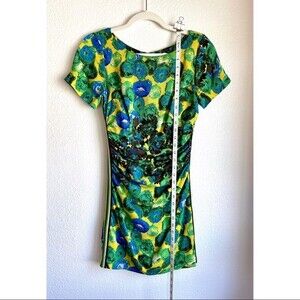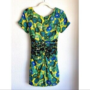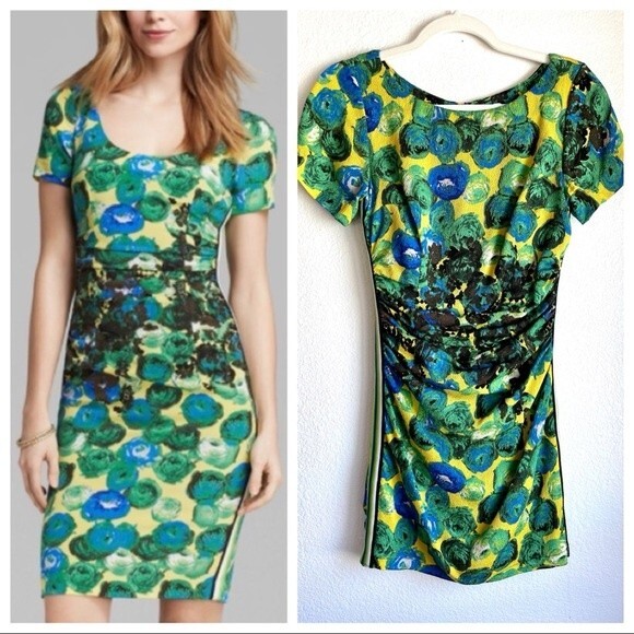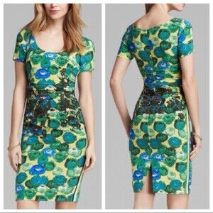 Gorgeous bodycon dress in a trademark vibrant floral print - a Tracy Reese classic. The silk blend fabric incorporates a black floral accent around the ruched waist, accenting your figure, and the coordinating racing stripes down both sides give the dress a fun flair. This sexy dress is sure to make you stand out.