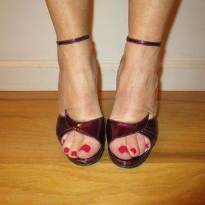 LAST CHANCE Heading to the trash shortly Worn, see pictures, made in ITALY, vintage high heel sandals, size 5. The color is a dark purple/burgundy metallic. The straps have a few nicks in them nothing that cant be fixed with a marker. Unique vamp pattern over the toe with a "halter" style ankle strap. These must be from the late 70s because the ankle strap has a "no hole" closure which means it latches on wherever you need it to be 4.25 inch stable heels. These are in great shape for their age. PLEASE LOOK AT ALL THE OTHER SHOES THAT I HAVE LISTED, THERE ARE MANY!