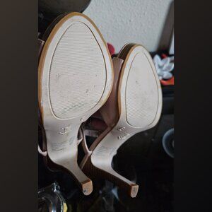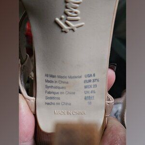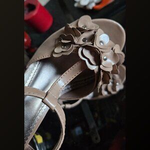 90s/Y2K vintage Fioni T Strap platform heels/sandals-nude/pink peach with a slight pearlescent iridescent shine-silver studded centers to the flowers/floral-open toe-ankle strap buckle adjustment/closure with elastic-4" heel/.5" platform-size 6 (fits like 5.5/6)-excellent/good condition considering age (signs of wear/age-refer to photos)-man made materials-