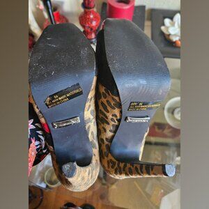 90s/Y2K vintage Shiekh platform heels-black/leopard print faux suede and red patent leather with button details-square toe-4.5" heel/1" platform-size 5.5-very good condition for age (minor signs of wear/age-refer to photos)- man made materials-