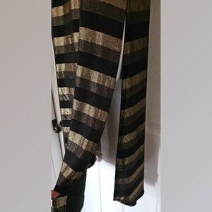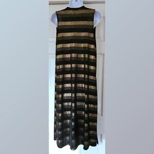 Y2K vintage LuLaRoe vest wrap/robe/cardigan-woven/knit-full length-black/bronze and gold metallic striped-soft/flowy/some stretchiness-high side slits on both sides-sleeveless-light/medium weight (poly/span-some sheerness)-36" bust (32"/34"-size variance possible), 45" length-says size XS (fits like S)-very good condition-