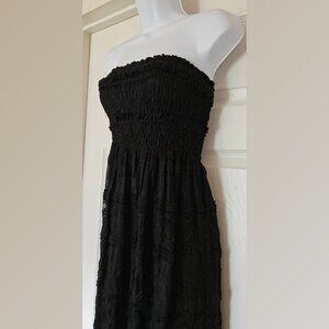 90s/Y2K vintage maxi tube dress-black full length flower/floral lace overlay-pull on/strapless-comfy/semi fitted/stretchy-elastic top edge for fit-full elastic smocked top-lined-see through bottom 6"-medium weight-no tags-fits like size S-34" bust (32"-38" bust variance with stretch), 48" length, 15"waist/22"hip (flat,unstretched)-good condition (minor signs of wear/age-refer to photos)-