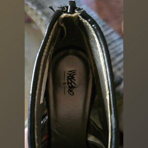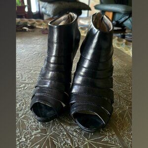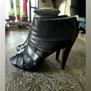 Y2K Vintage Mossimo bootie/pump/heel shoe-black faux leather-soft!-strappy ankle shoe-open toe-back heel zipper closure-platform-4" heel/.75" platform-size 6.5-good condition for their age (minor signs of wear/age-refer to photos-some scuffs on heel/toe/sole)-man made materials