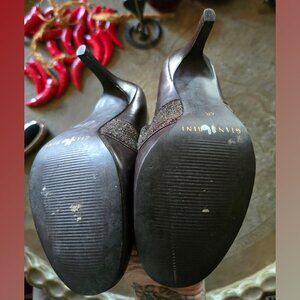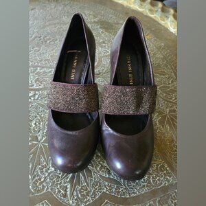 90s/Y2K Vintage Gianni Bini pump/heel/shoe-dark chocolate brown (I believe leather) with a wide metallic woven elastic sparkle dark brown/gold/brass colored fabric arch strap-round toe-comfy/soft-3" heel-size 6-very good condition for their age (very minor signs of wear/age-refer to photos-very minor scuffs on heel/toe/sole/fading)-