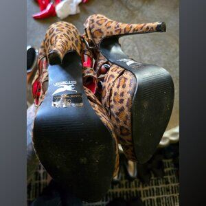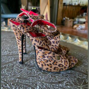 90s/Y2K Vintage Shiekh bootie/pump/heel/shoe-brown/tan leopard animal print-faux suede with brass studded detail strappy look-ankle buckle closure-open toe-platform (4.5" heel/1" platform)-size says 5.5 (fits like 6)-good condition for their age (very minor signs of wear/age-refer to photos-mainly age-strap/toe/sole)-man made materials-