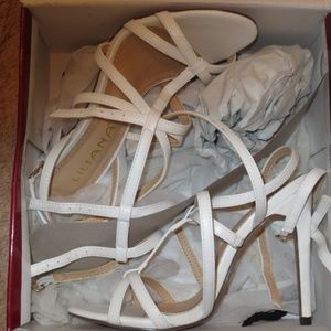 Last chance, Bo more reductions heading to the trash shortly New, in the box, LILIANA white high riding double ankle strapped heels, size 6. Really sexy strappy high on the ankle double ankle strap high heeled sandals, 4.5 inch heels