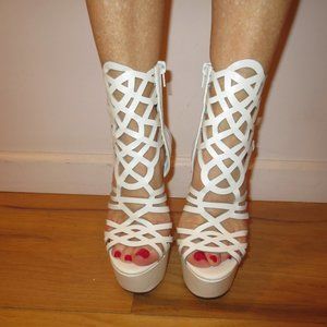 Last chance, Bo more reductions heading to the trash shortly New, no box white laser cut platform heel stiletto double ankle buckle heels, size 6. Made by Paper Fox, sexy design, easy to walk in. 6.5 inch heels, 2 inch platforms.