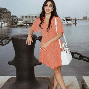 Feminine and flirty pleated design wrap dress in a striking orange and pink print!