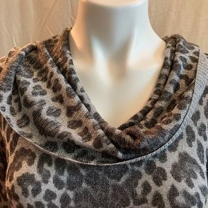 Cowl neck, glitter thread, leopard print.