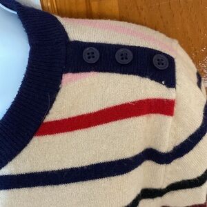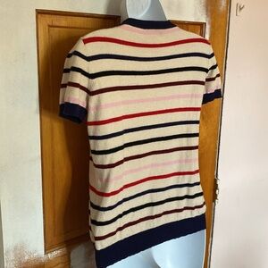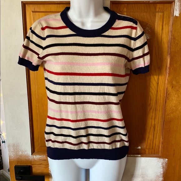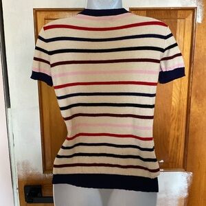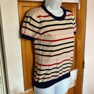 This Modcloth ringer tee showcases a chic cream base with pink, red, navy, burgundy, and black striped pattern, complemented by a ribbed crew neckline and short sleeves. Crafted from a lightweight knit, it's perfect for casual wear with a touch of vintage flair.