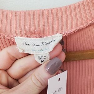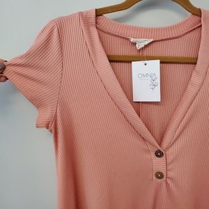 Features: deep v-neck, faux wooden buttons, cap sleeves, ribbed texture, very stretchy, medium weight