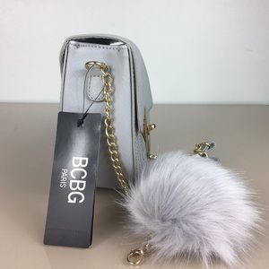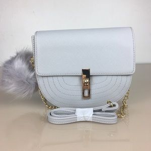 Attached partial chain shoulder strap. Foldover flap with dual option turn-lock closure. Exterior features front chain embellishment, detachable pompom detail, and textured detail. Interior features 1 zip wall pocket. Approx. 6 H x 8 W x 3 D. Approx. 23 strap drop. Imported
