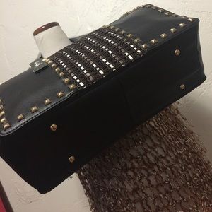 Oversized Bag: Great bag for any occasion, Vegan Leather, stud embellished, Tote straps plus removable shoulder strap, open roomy interior, inside zip pouch. 16" X 12" X 5".