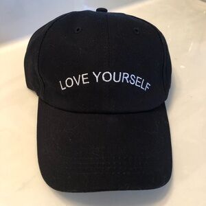 Cutest baseball cap! Brand new with tags attached . ladies Sz one size fits most. Looks so cute on . Adjustable in back . Black with white Embroidered “Love Yourself” across the front.