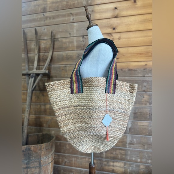 NWT. Adorable, functional & sturdy. Hand braided. Strap is 3” wide. 30” Multicolor Strap, 19” Tall, 24” Opening