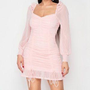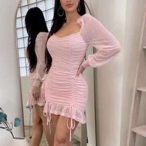 Elevate your daytime look with this charming NWT Privy Women's Ruched Bodycon Dress in a delightful baby pink hue. The dress features long mesh puff sleeves, adding a touch of elegance to your style. Chic tie accents and ruched detailing enhance the dress, ensuring a flattering fit for any occasion. With a back zip closure, it's easy to slip into this stretchy and comfortable dress. Whether you're attending a brunch with friends or heading out for a day of fun, this dress is the perfect choice. Embrace your fashion sense and make a statement with this captivating bodycon dress.