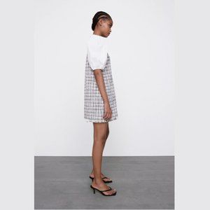 Blue/white mini dress with round collar and V-neck front. Contrasting short balloon Sleeves. Frayed hem. From ZARA, in size M and L. New with tags. Sold out in stores.