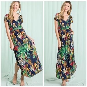 Feminine Chic maxi dress. Dark navy color with a vibrant contrasting tropical print. Material is stretchy and comfortable. Waist is elasticized for fit and comfort. Short sleeves and on trend side pockets. Flirty V-Neckline and side slits add extra style to this adorable maxi dress. Wear to a picnic, party, date, luau, beach outing, dinner, lunch, girls night out, vacation wear. Perfect for Summer wear !
