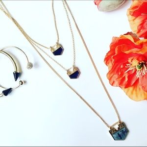 18k played gold, nickel free, lead free. Excellent quality. 25-28" chain. The two dark stones are more of a deep blue. GORGEOUS, Fuss free layered look 👍🏼 Price is FIRM on retail items, unless bundled using the bundle feature. MSRP $42 + tax ✨ Please Note✨ 🔹NO trades 🔹NO holds 🔹NO offsite transactions 🔹NO low ball offers 🔹Please ask questions if you're unsure about an item! ✨BUNDLE AND SAVE✨