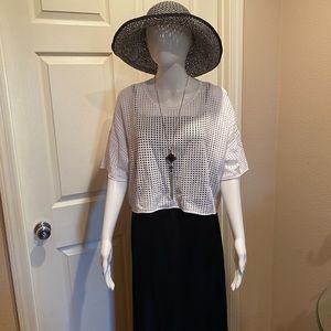 White lace detail, high neckline. 100% polyester. Lined, chiffon like overlay.