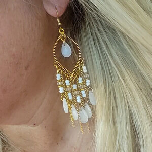 Faceted simulated milk glass and dramatic chain fringe with hypoallergenic wires.
