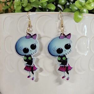 Creepy-cute skull girl with black cat.. and the whole piece glows in the dark! Lightweight, on hypoallergenic wires.