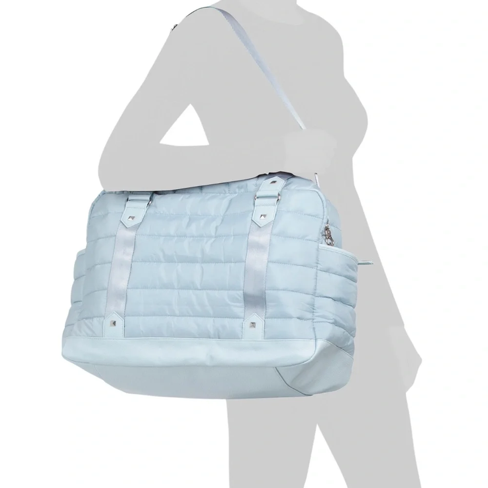 Dual carry handles, adjustable detachable shoulder strap, convertible style, quilted, stud accents