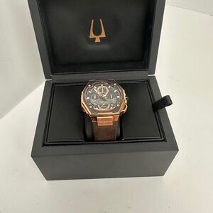 Marking the 10th anniversary of the Precisionist movement, the Series X Special Edition is a celebration of unparalleled accuracy. The special edition timepiece features a distinctive rose gold-tone stainless steel case with a gray Damascus steel top ring insert. The black dial features a calendar window and a view into the proprietary Precisionist eight-hand chronograph high-precision quartz movement. The fine brown leather strap is complete with a deployant buckle. The case features a curved sapphire crystal with AR coating, screw down case back, and water resistance to 50 meters.