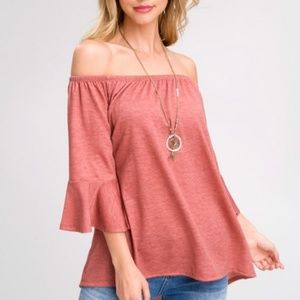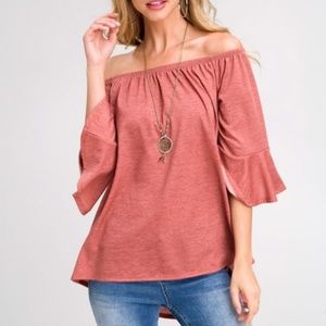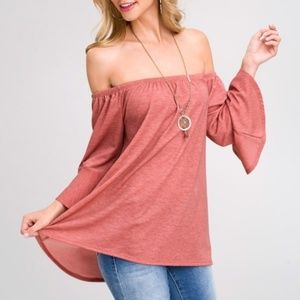 An off the shoulder solid knit top with bell sleeves featuring a high low hemline. Fabric is soft and comfortable.