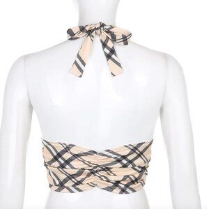 LAST Small Plaid Print Crop Top Backless Tie Halter Top Ruched Cami