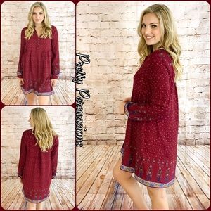 LAST TWO‼️Wine Long Slv Border Print Peasant Dress