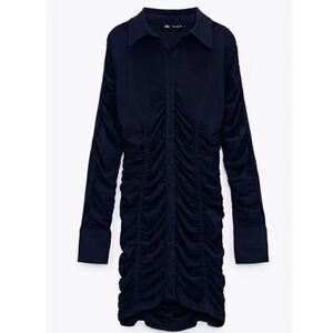 Short fitted dress with lapel collar. Long sleeves with cuffs. Draped fabric. Front button closure.