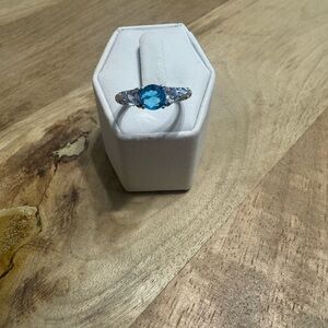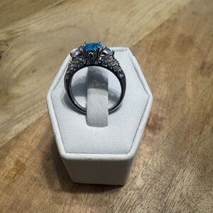 This stunning women's ring features a captivating blue gemstone surrounded by sparkling silver accents. Perfect for adding a touch of elegance to any outfit.