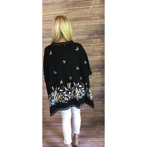 Black Kimono Style Poncho. Absolutely gorgeous lace knit detail and pattern. Side slit. Can pair with tank or beautiful bralette due to side slit/open front knit detail. Boho oversized fit. Dress it up or down. 100% Soft Rayon. Bust S 38" M 39" L 40"