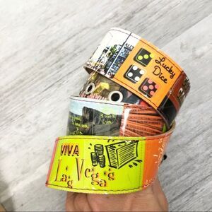 Awesome Las Vegas Nevada themed belt. Material is plastic. Silver buckle. If you love all things gambling, nightlife, entertainment, and casinos, this one’s for you! Perfect for a Vegas trip! Women’s size large with holes from 33-37” as shown.