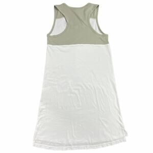 Women's racerback tank dress taupe/white size small. Has a slight step hem and split seams at the sides. Fit: Ladies' Modern - Semi-fitted. Stock photo shown for fit. 100% Cotton. Machine wash, tumble dry low. Due to light and screen setting differences, the color may vary slightly from the photos