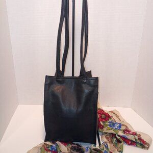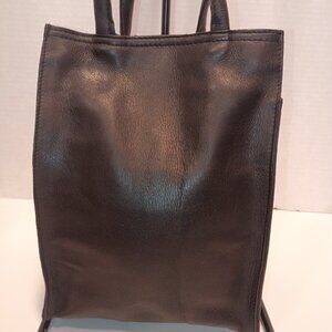 For the minimalist, as basic as it gets! From luxury brand LATICO, this black leather shoulder bag looks like a basic paper bag with straps added. Boxy and basic, this bag has a slipper pocket on one side, Velcro closure, and opens to a cloth lined interior with zipper pocket and slippers. Double straps are padded rope=like handles.
