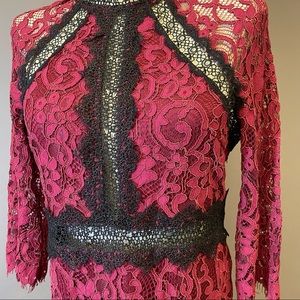 High neck, long back zipper, fully lined, sleeves and black lace details are sheer. Scallop hem, sleeves and neckline. Size L, rum a little smaller, not stretchy. Flat measurements pit to pit 18”, waist 16”, sleeve from neckline down 23”, length 43”. No stains no rips