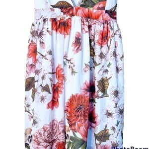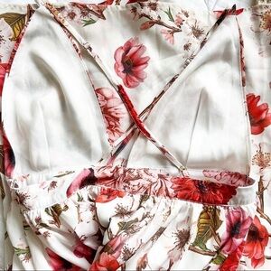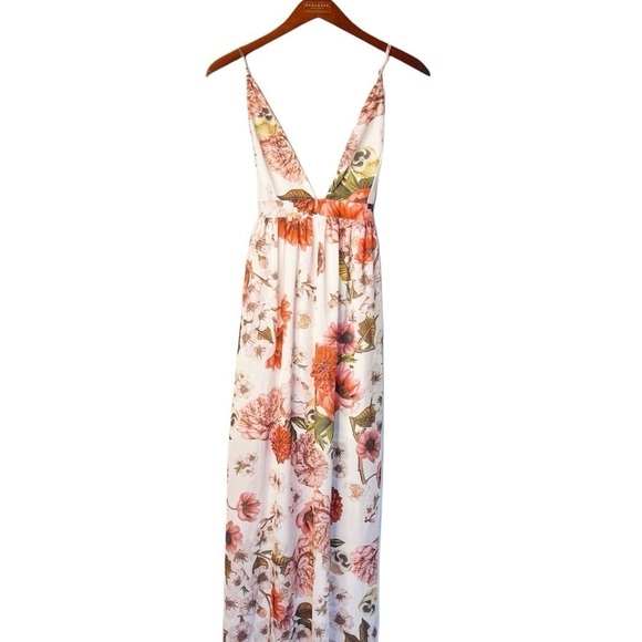Beautiful Deep V Neckline Halter Cross Back Maxi Dress from L’atiste By Amy. This is a beautiful full length Dress that features delicate adjustable spaghetti straps that cross at back. Empire waistband with a pleated skirt. High split skirt on each side of hem. All over floral print in soft pastel colors Pink, Coral, Cream and Tan. Lined though chest and bodice. Hidden side zipper. 100% Polyester. Woman’s