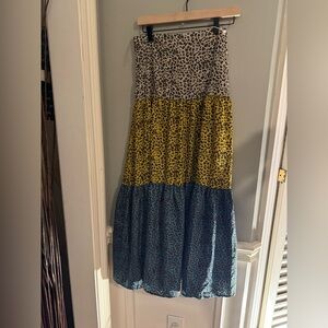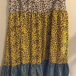 Stylish maxi skirt with a bold leopard print. Features a colorblock design with three vibrant sections. Perfect for casual outings or a day at the beach.