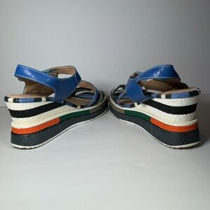 Stylish platform sandals with vibrant stripes. Features blue, black, white, and green accents. Perfect for a bold look.